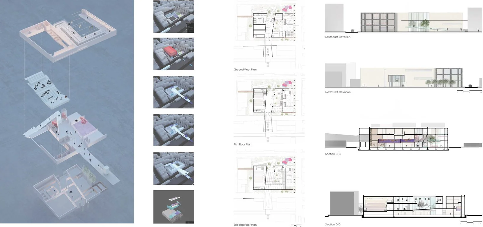 The project proposes the creation of a mixed-use cultural and leisure hub in the heart of Patras, reconnecting two central urban blocks that are currently divided by the railway line, which disrupts pedestrian circulation and spatial continuity. One block hosts a cinema and leisure facilities, while the other contains housing, storage areas, and a large portion of unused space. The design introduces a new cultural center that bridges these two blocks both physically and socially, revitalizing the surrounding area and fostering community engagement. The existing structural framework of the abandoned building on site is preserved and integrated into the new complex, transforming it into an active vertical infrastructure that accommodates interconnected entertainment and cultural activities. The core feature of the proposal is an indoor climbing facility, designed as a vertical axis of movement and interaction, symbolically and functionally linking the building’s different levels and programs.